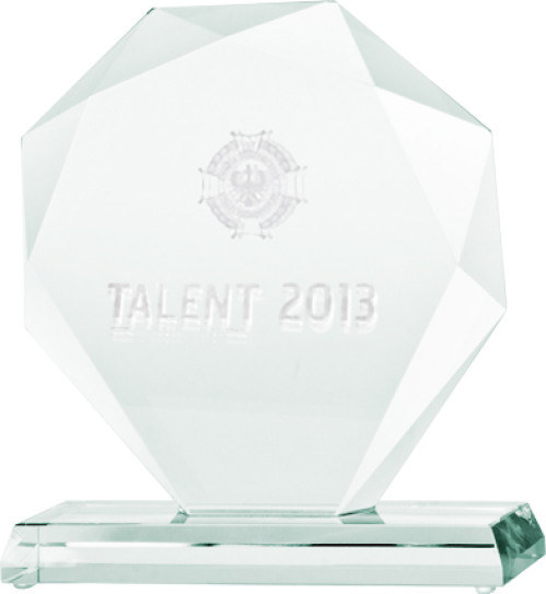 Trofeum szklane z nadrukiem kolorowym LuxorJet, grawerowaniem oraz wypełnieniem farbą i etui
